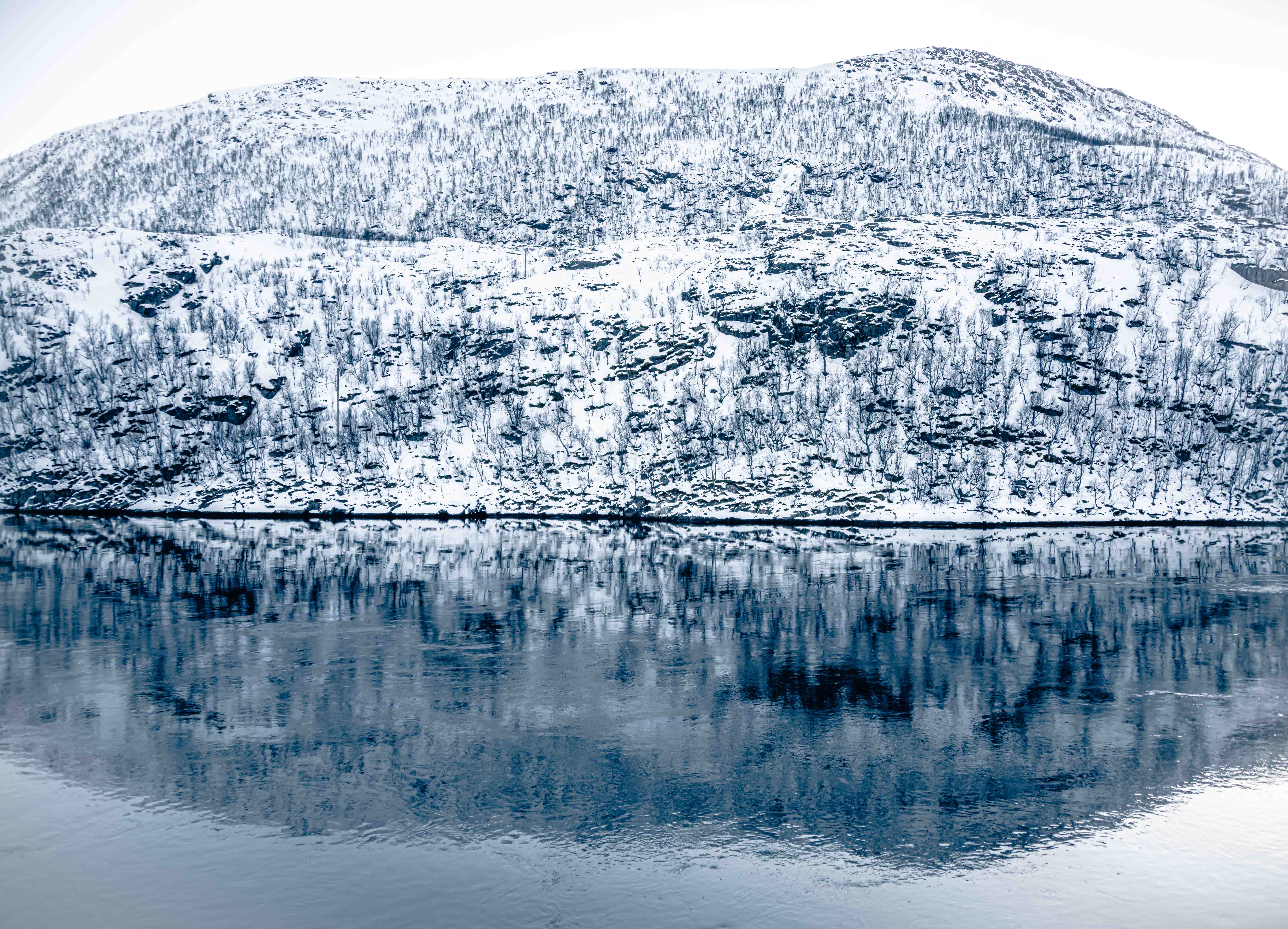 Everything else was very still and spooky, the hills, the snow, the shrubbery, the water.