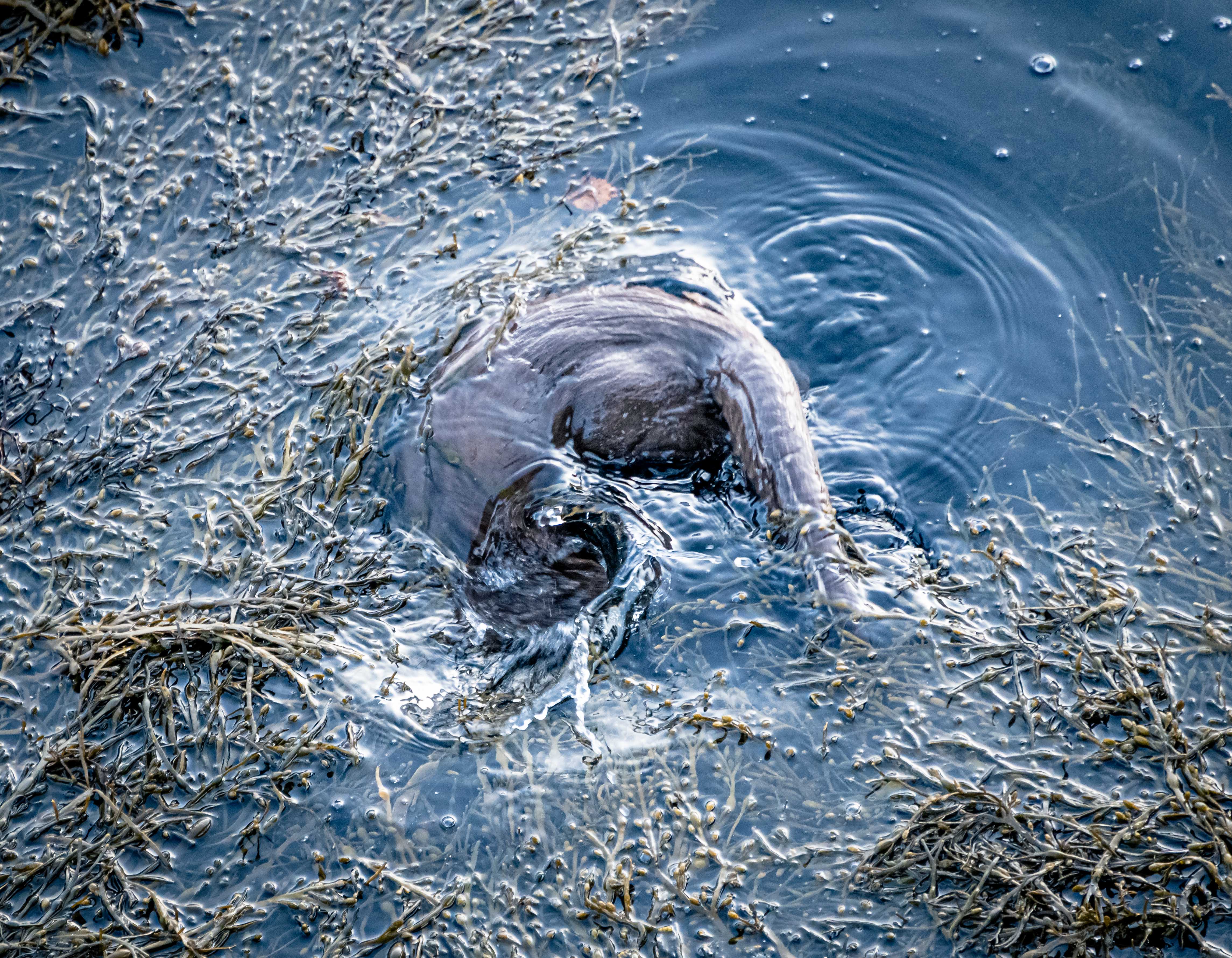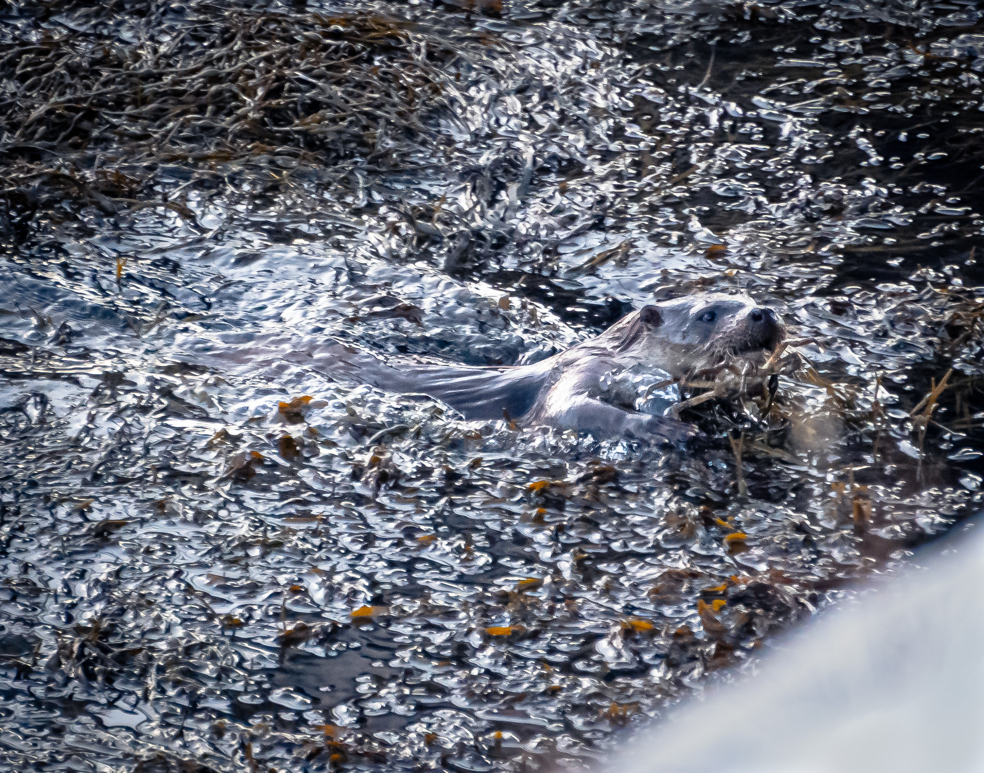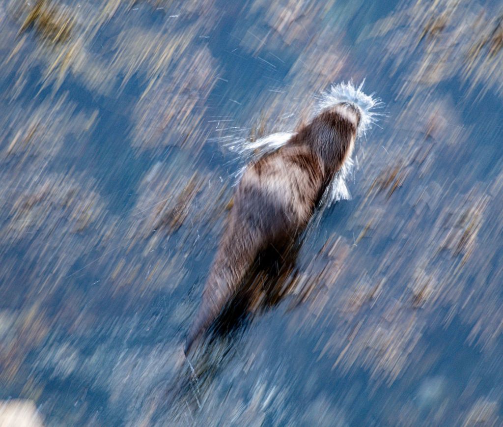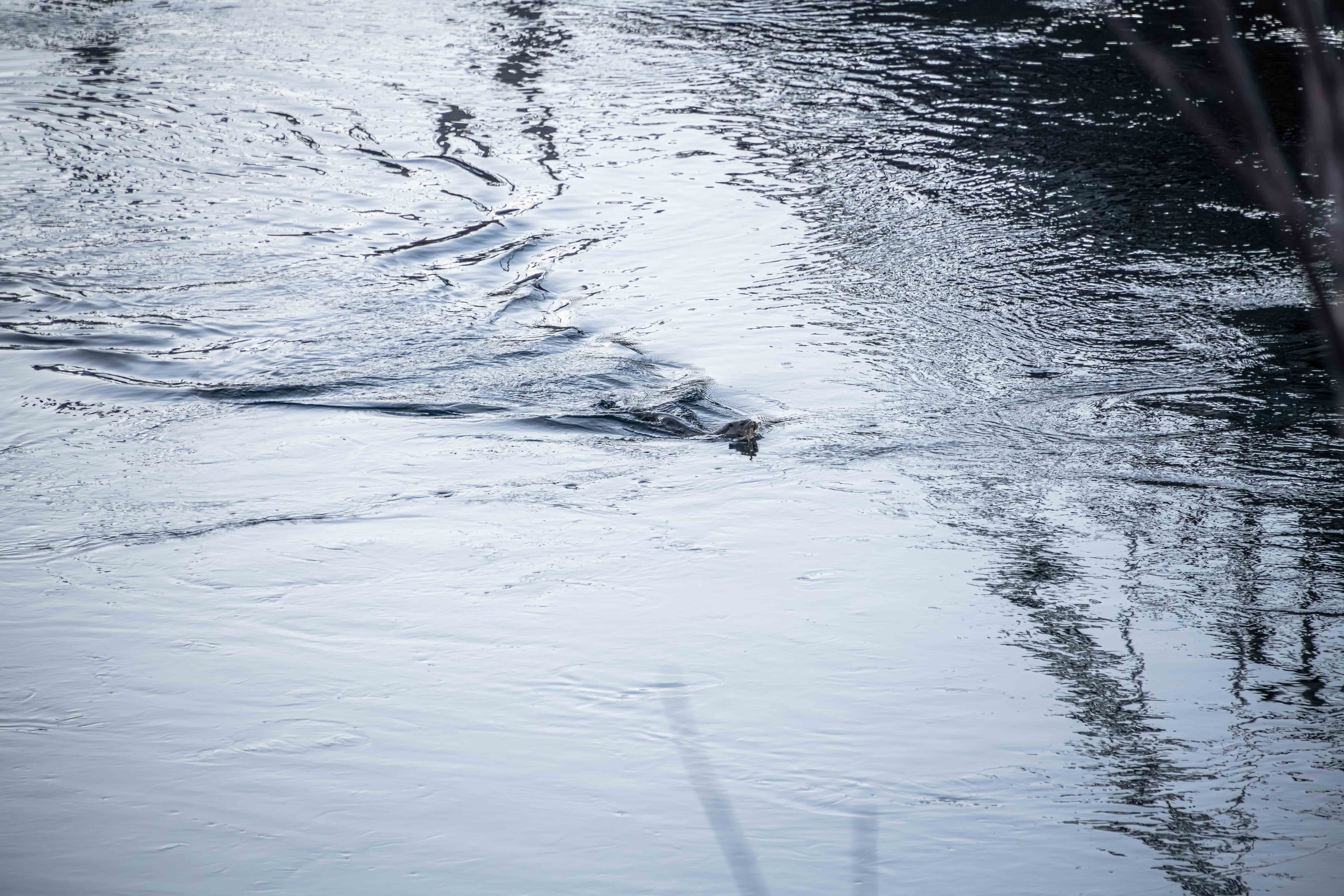 A quick inspection of a shot at full optical zoom (300mm) revealed that the wake had a slender, streamlined body, and also ears and whiskers. It was an otter! And then it started heading in my direction.